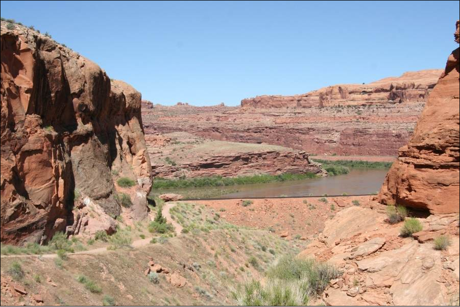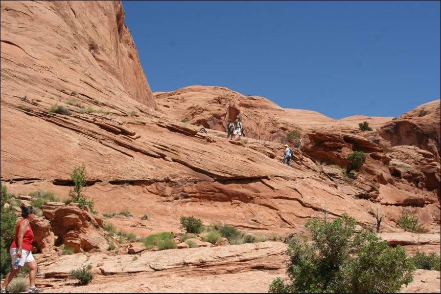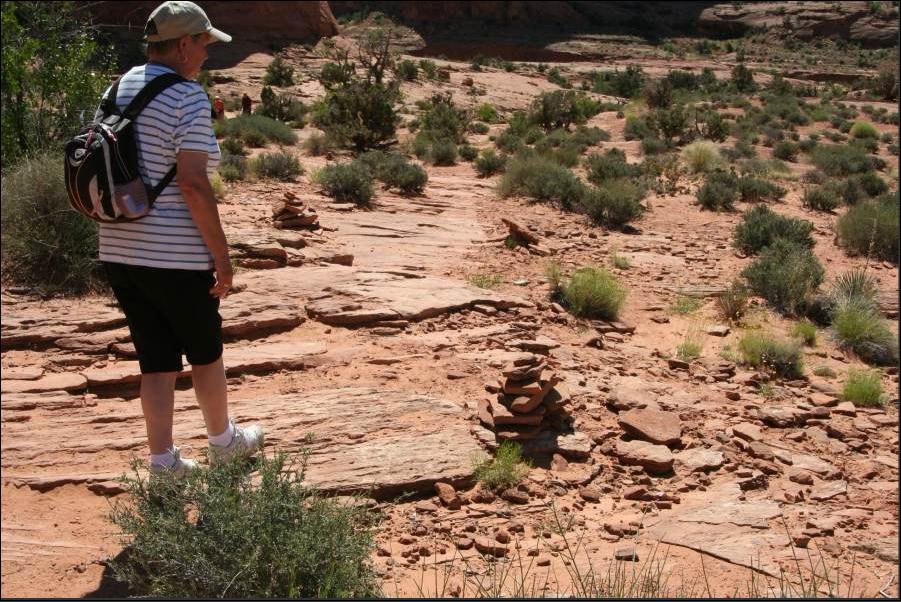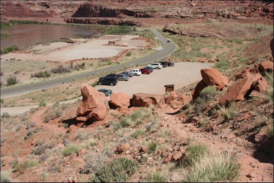 Aller Anfang ist steil und steinig,oberhalb sieht man den Parkplatz und den Campground,der keinerlei Schatten bietet